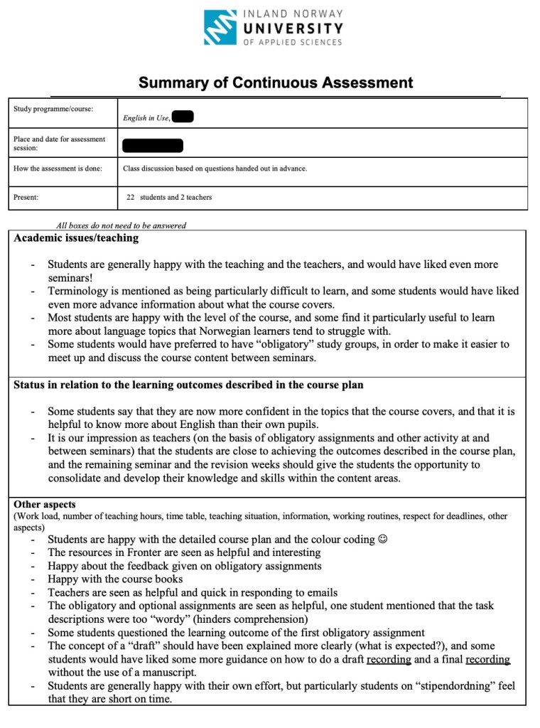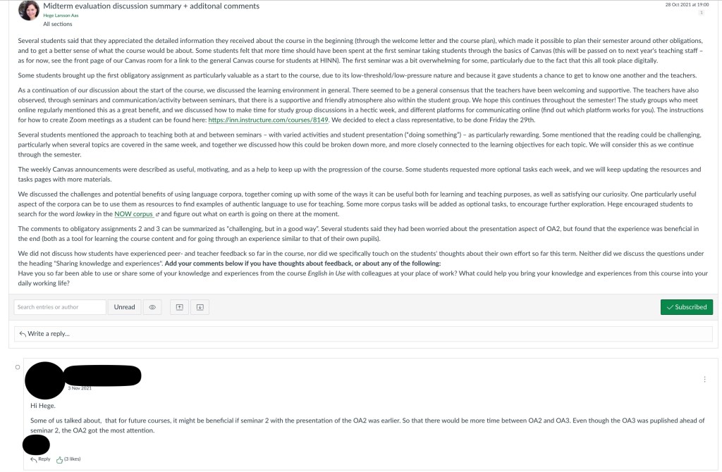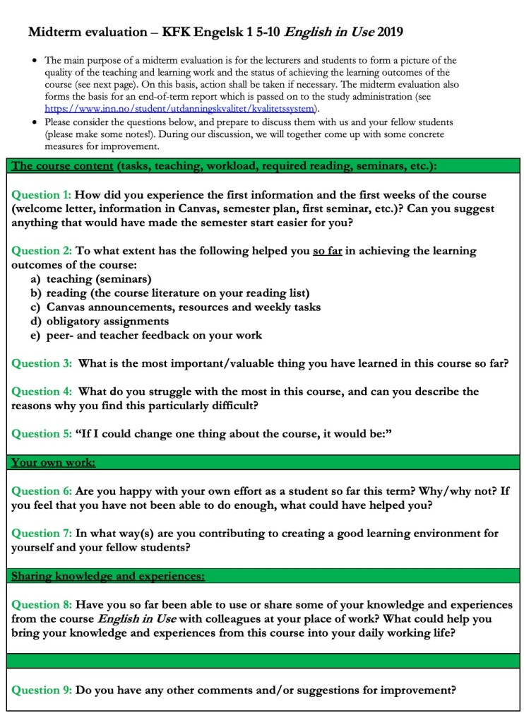 Midterm evaluation: Example of a midterm evaluation process in an in-service teacher education course. The students were given a form (1) in advance, and I lead a class discussion based on the questions in the form and took notes, which were later summarized and shared with the students online (2).